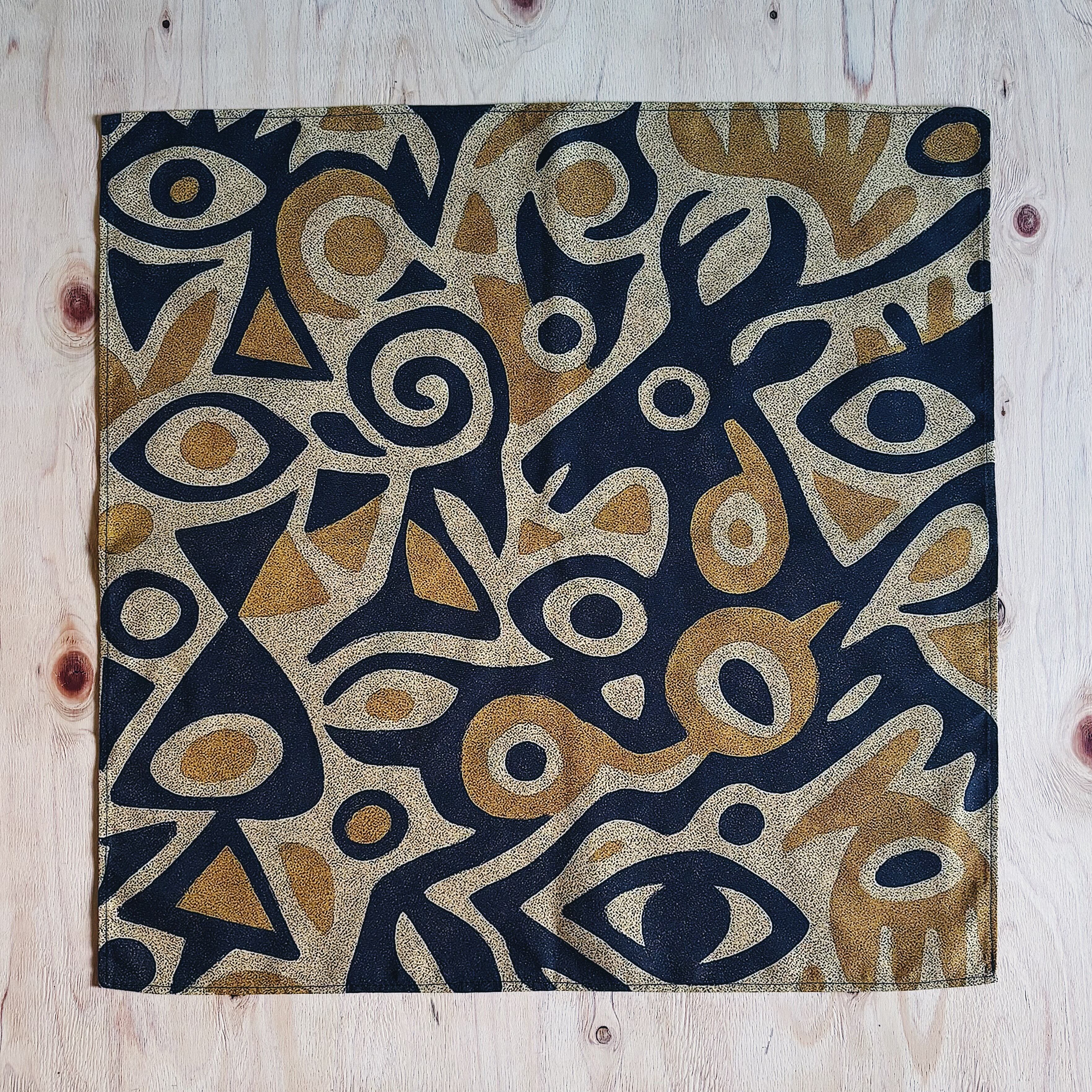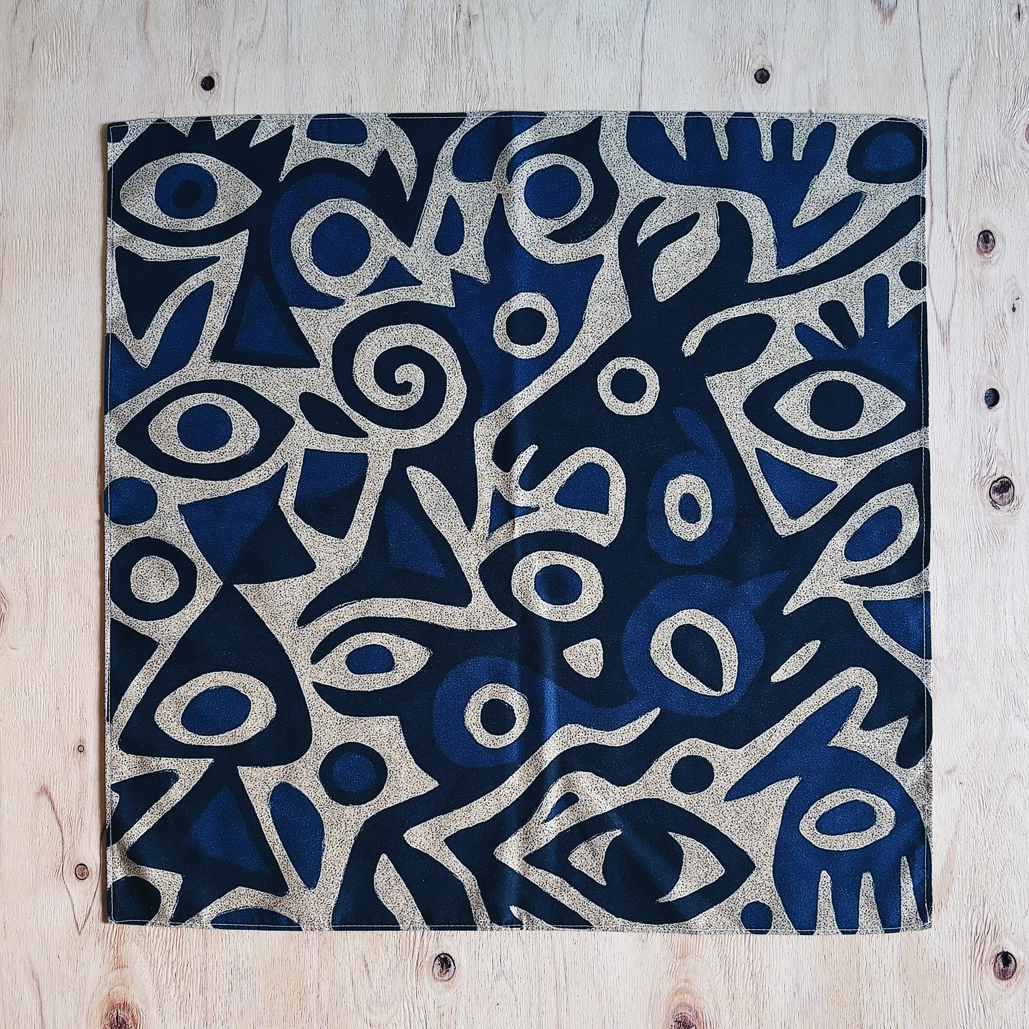 ブルームースプラントによるオリジナルグラフィックのバンダナ。迷彩柄に見立てて配置された鹿のシルエット、螺旋、目のモチーフたちは、プリミティブで呪術的、そしてどこかポップ。野性と抽象が交差するテキスタイルアートとして仕上げました。