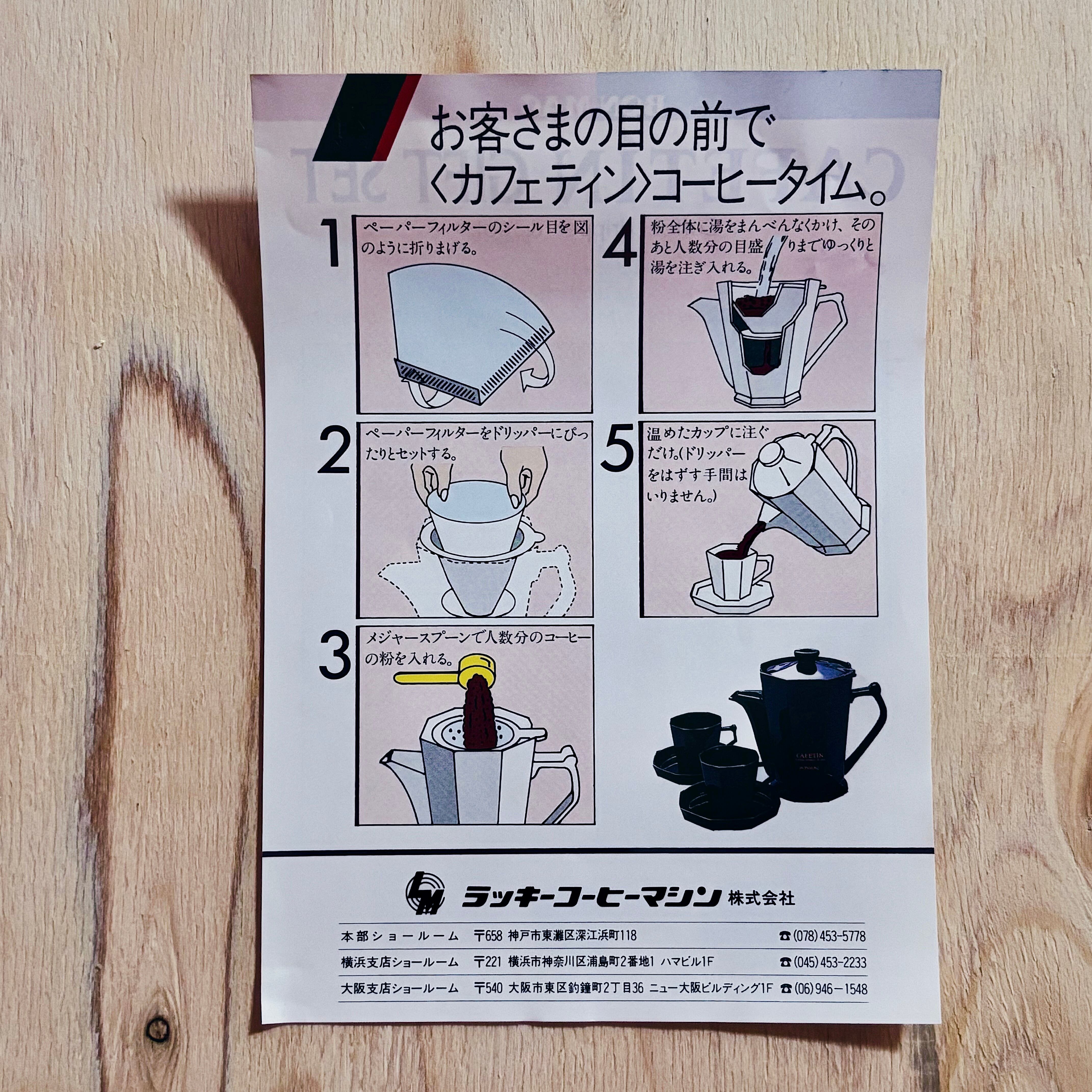 このCAFETINシリーズは、業務用機器で知られるラッキーコーヒーマシン株式会社(LUCKY COFFEE MACHINE CO., LTD.)が製造元。ドリッパーとポットの組み合わせはCAFETINオリジナルで、現在はすでに製造終了している廃盤品です。まさに「昭和の台所が生んだちいさなイノベーション」と呼びたくなる名品です。コレクションとしても、実用器としてもおすすめ。現代の空間にもどこか優しくなじむ、ヴィンテージらしい魅力があります。