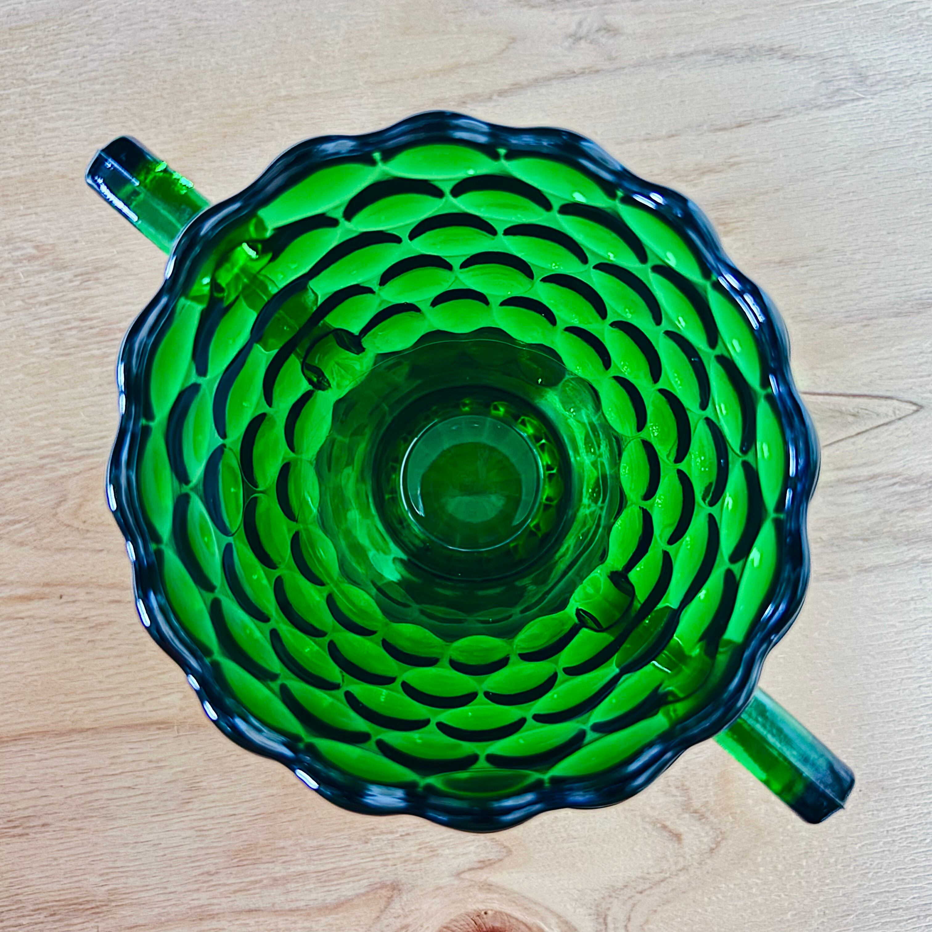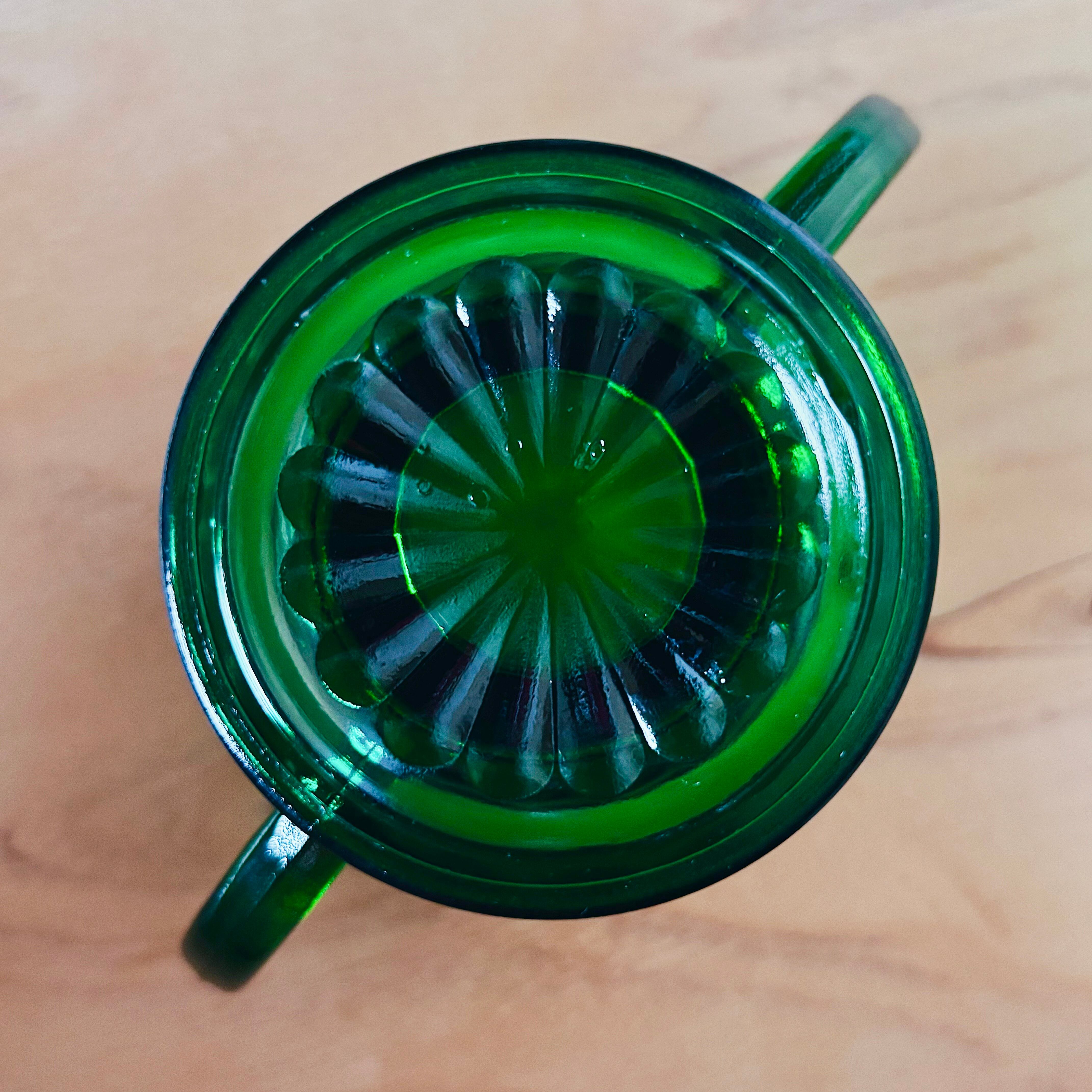 ふたつの持ち手と、ころんと丸い脚付きフォルム。フォレストグリーンの深い色味は、陽の光を透かすと、どこか森の中の朝靄を閉じ込めたような透明感。もともとは砂糖壺として使われていたものですが、小物入れや花器など、自由な使い方で愉しめます。