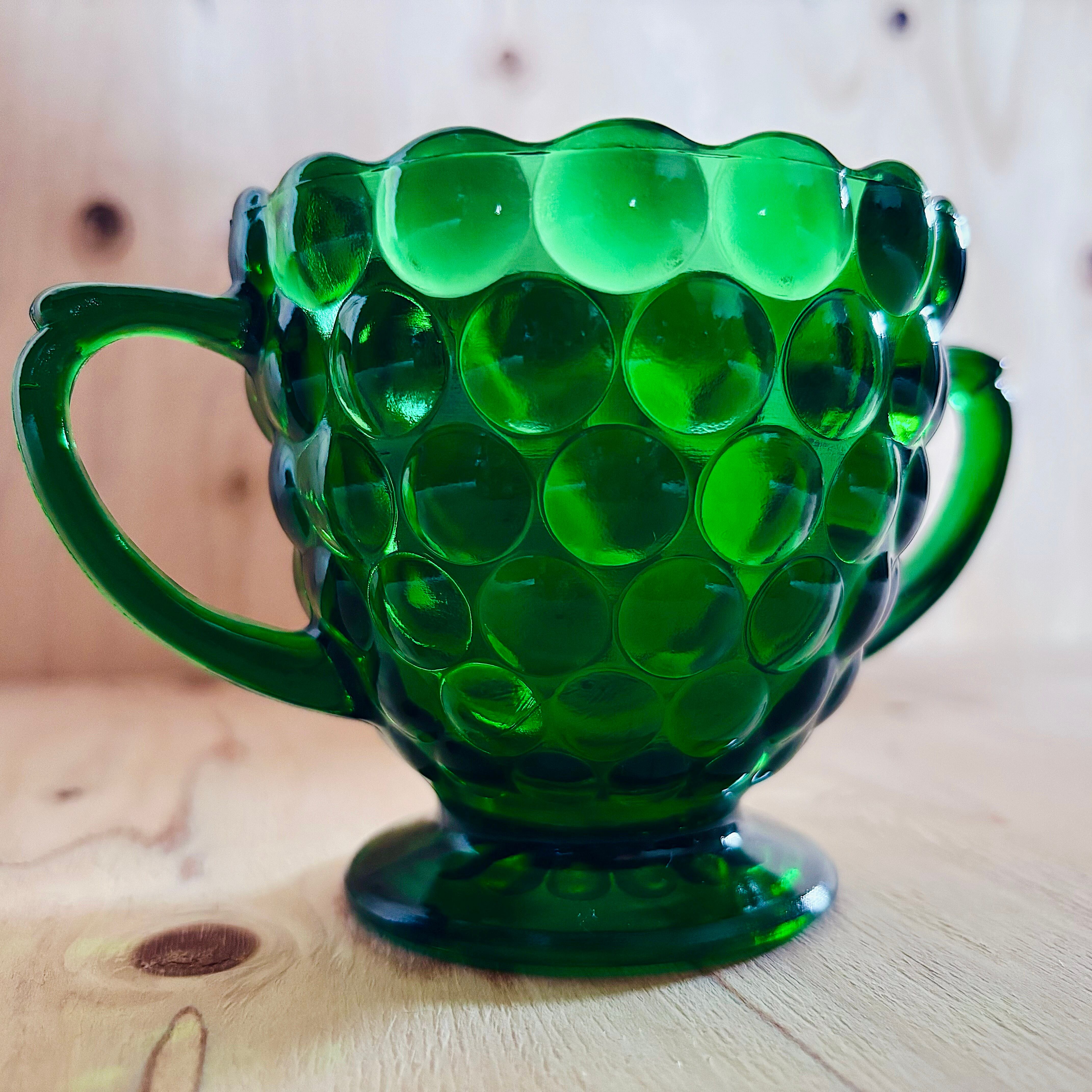 まるで小さな気泡が連なったような、愛らしい佇まい。こちらは1950〜60年代にアメリカの老舗ガラスメーカー Anchor Hocking(アンカーホッキング)社が製造していた「バブル」シリーズのオープンシュガー。耐熱ガラス「Fire-King(ファイヤーキング)」の製造元としても知られる同社ならではの、温もりあるヴィンテージガラスです。