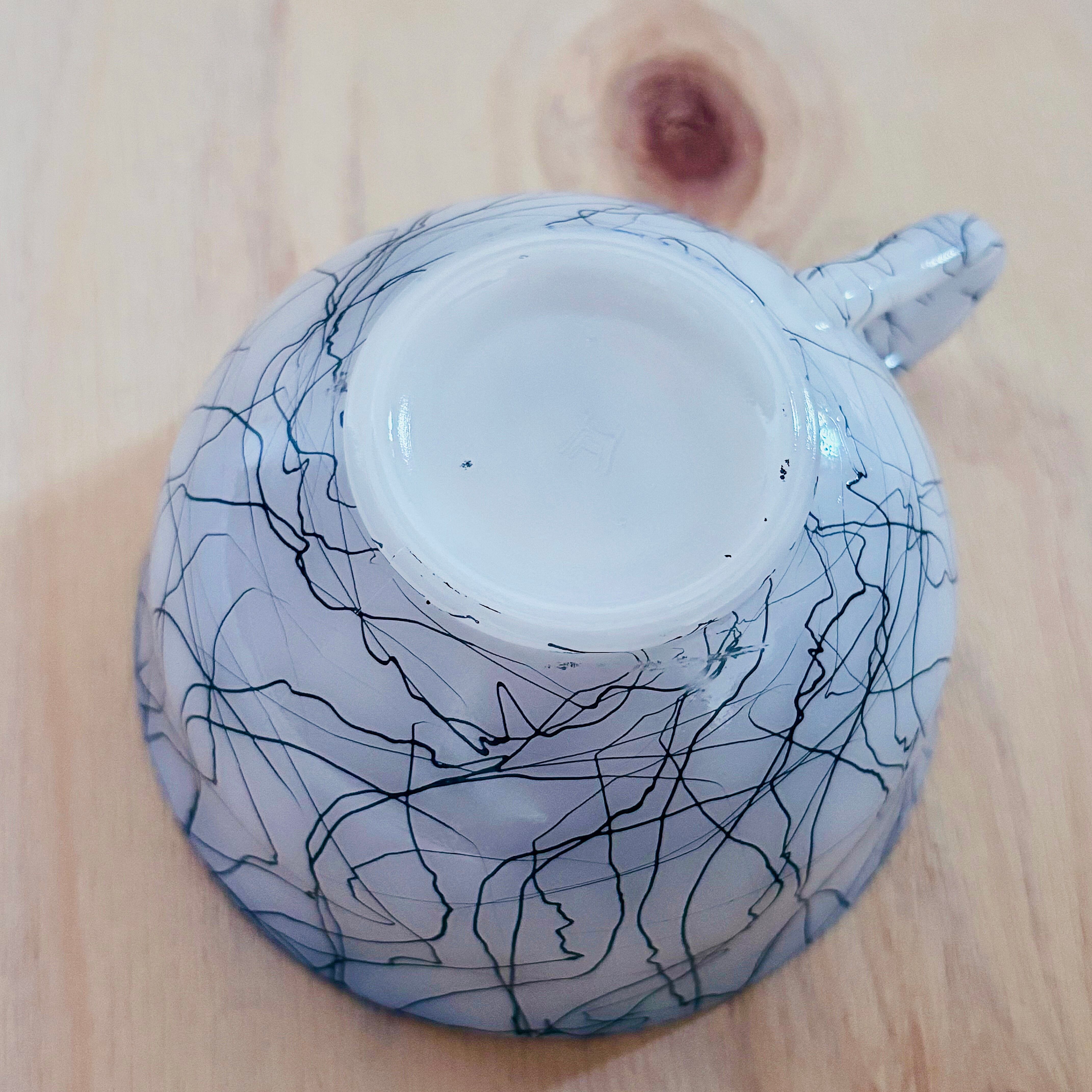 1940〜50年代のアメリカで生まれた、Hazel Atlas(ヘーゼルアトラス)社の「Midnite Magic」シリーズのカップ&ソーサー。まるで黒インクを垂らしたような、自由奔放で抽象的な模様が魅力の一点。個体ごとに異なる模様が描かれており、まさに一点モノの芸術品ともいえる存在です。