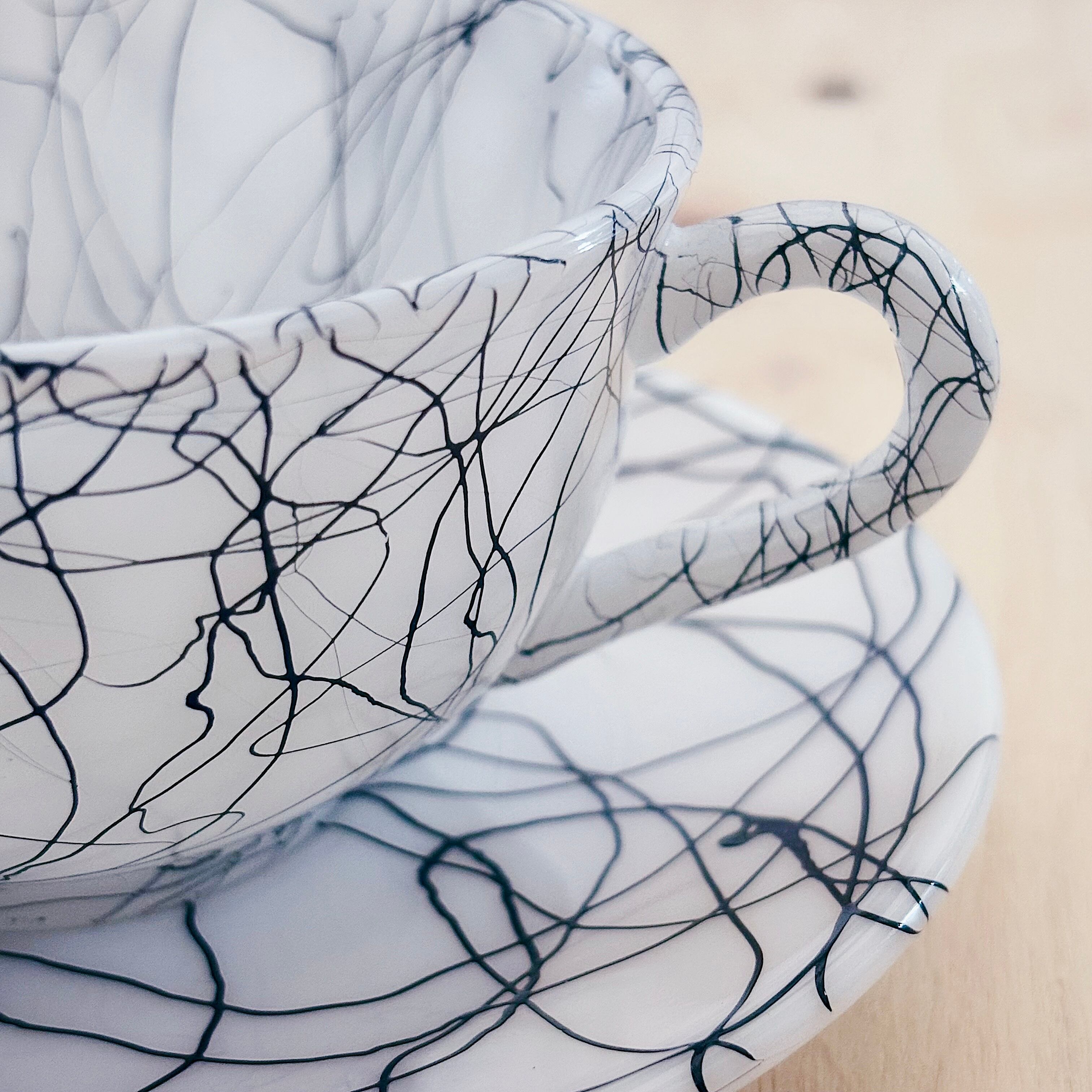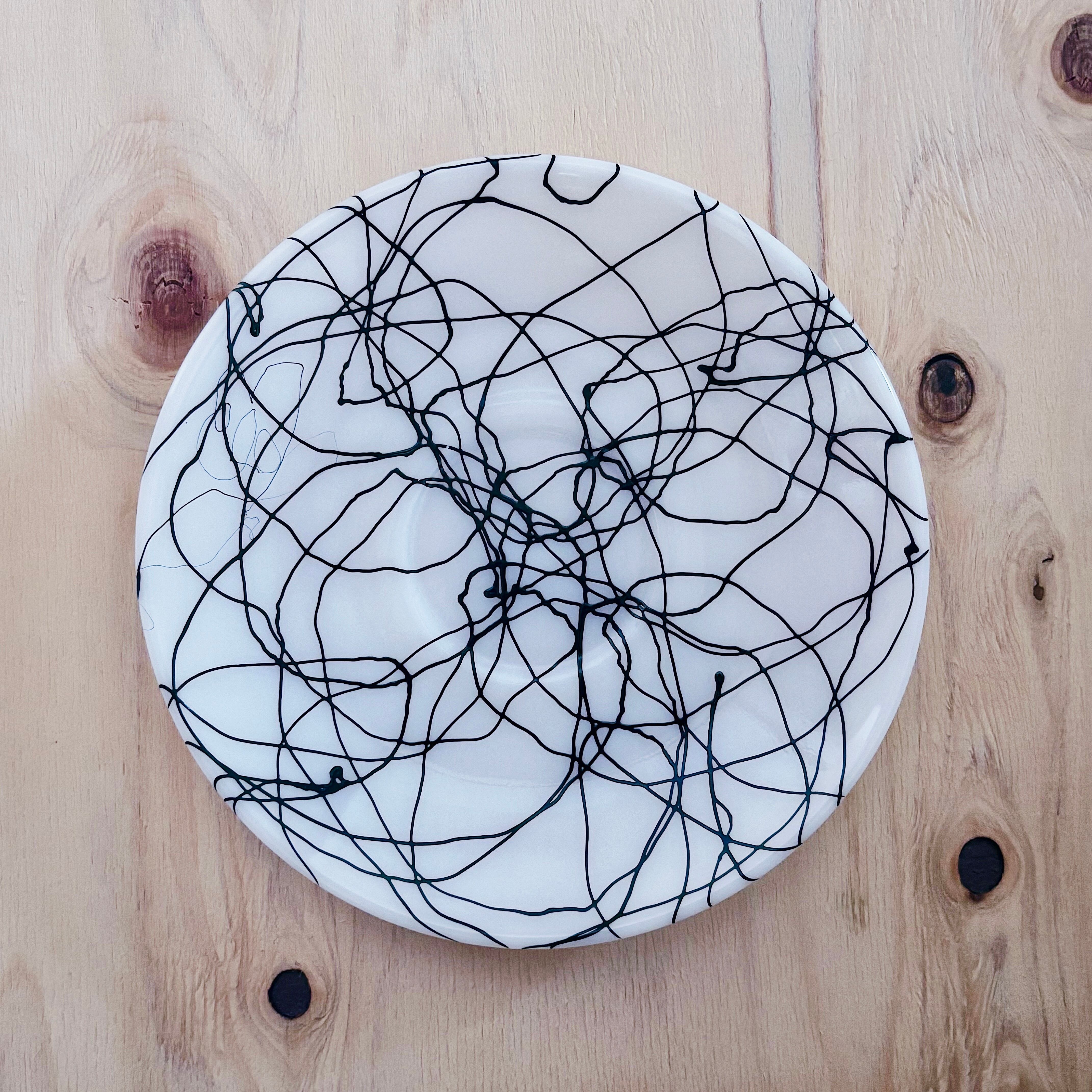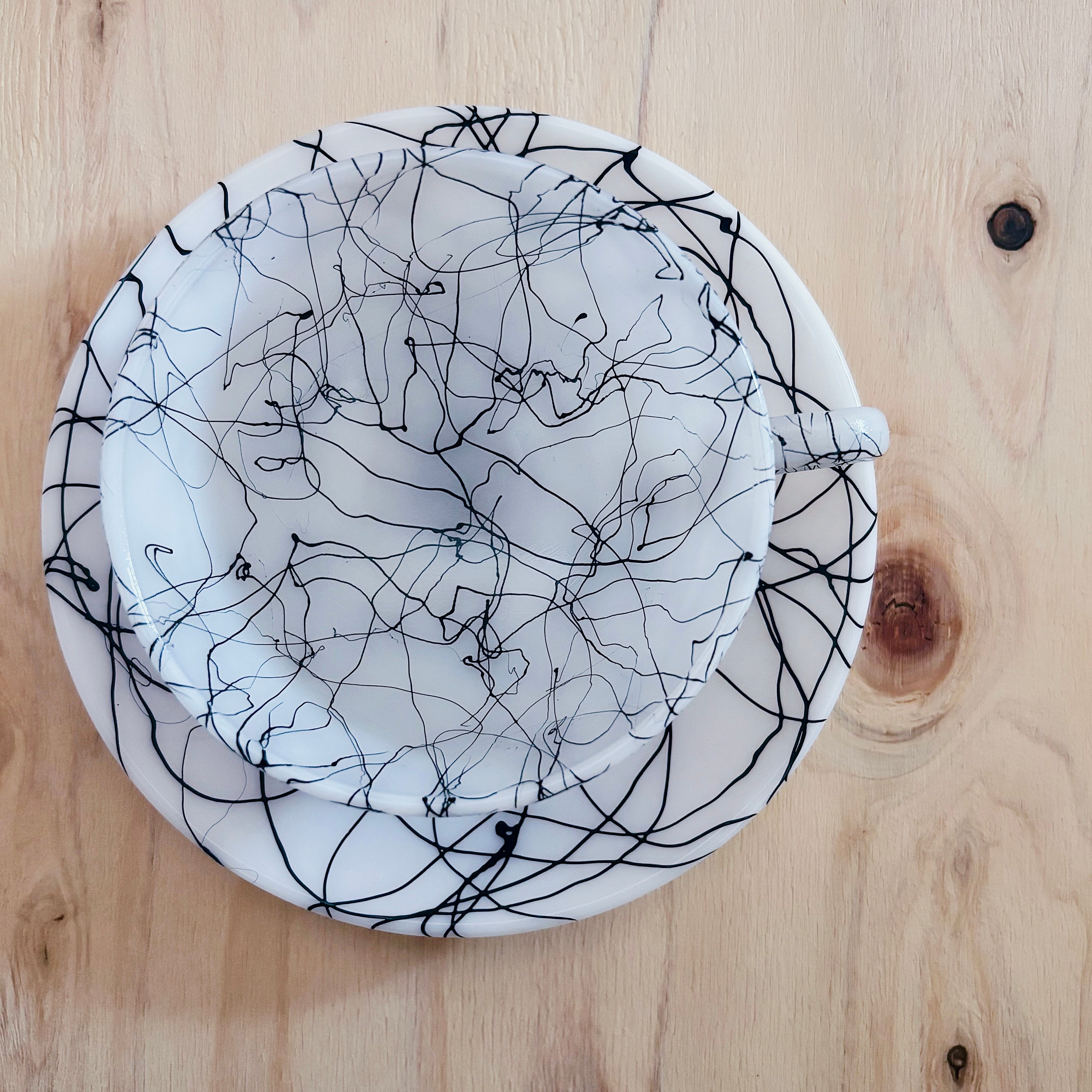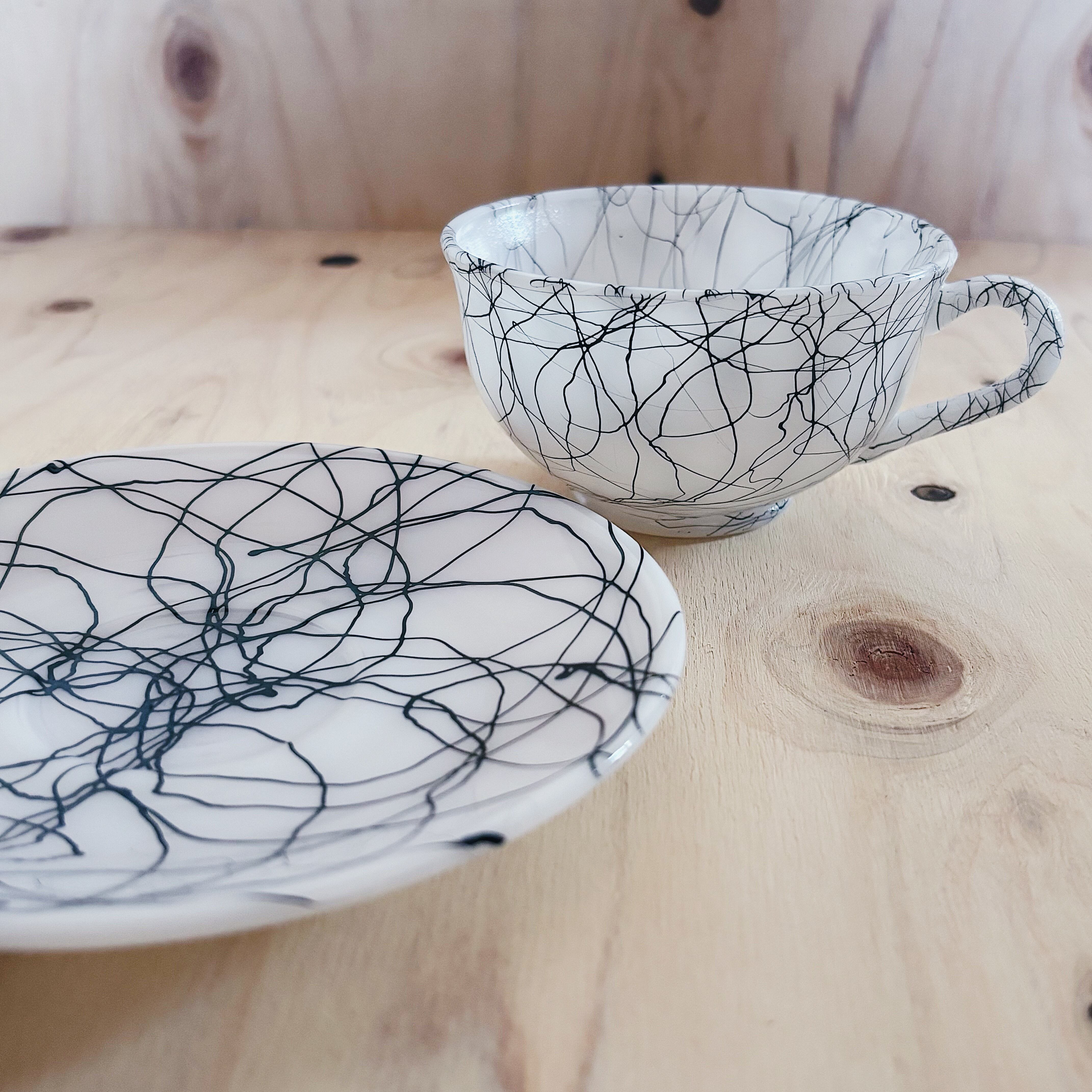 白地のミルクガラスに広がる黒のラインは、どこかジャクソン・ポロックを思わせるような大胆さと繊細さを併せ持ち、テーブルの上で圧倒的な存在感を放ちます。