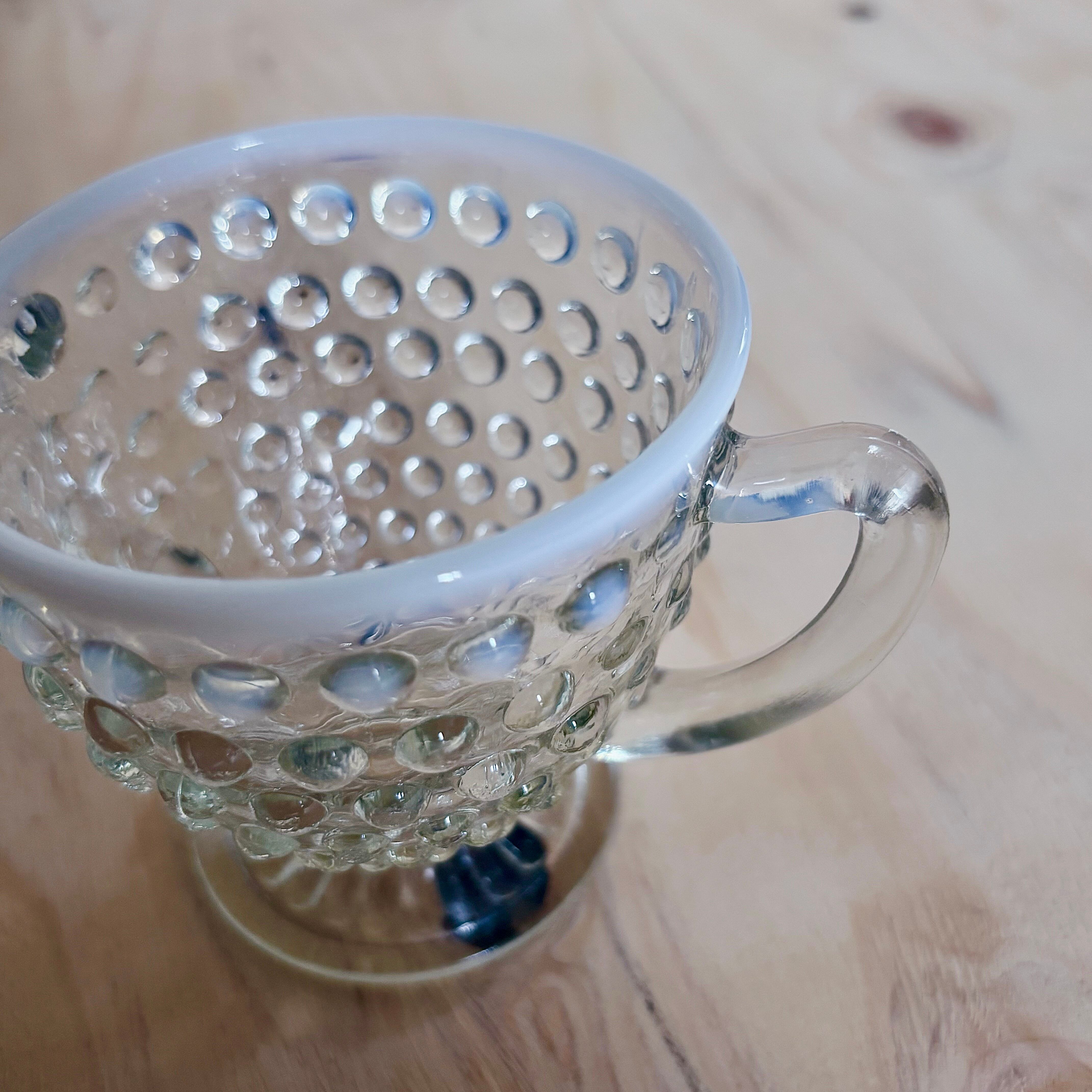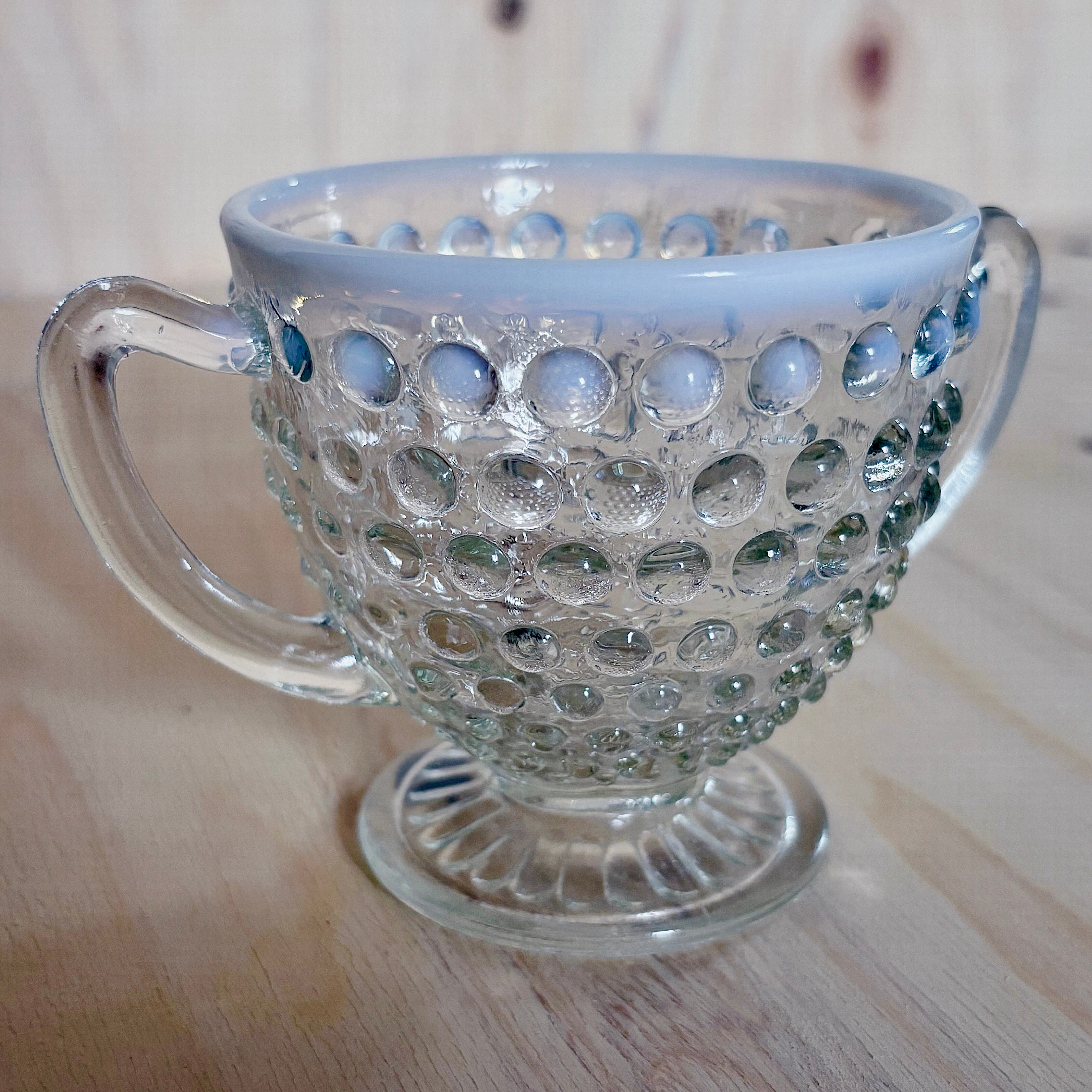 まるで月の光をすくい取ったような、静かな佇まい。こちらは1940〜50年代にアメリカの老舗ガラスメーカー Anchor Hocking(アンカーホッキング)社が製造していた「ホブネイル」シリーズのオープンシュガー。耐熱ガラス「Fire-King(ファイヤーキング)」の製造元としても知られる同社ならではの、清らかで気品あるヴィンテージガラスです。