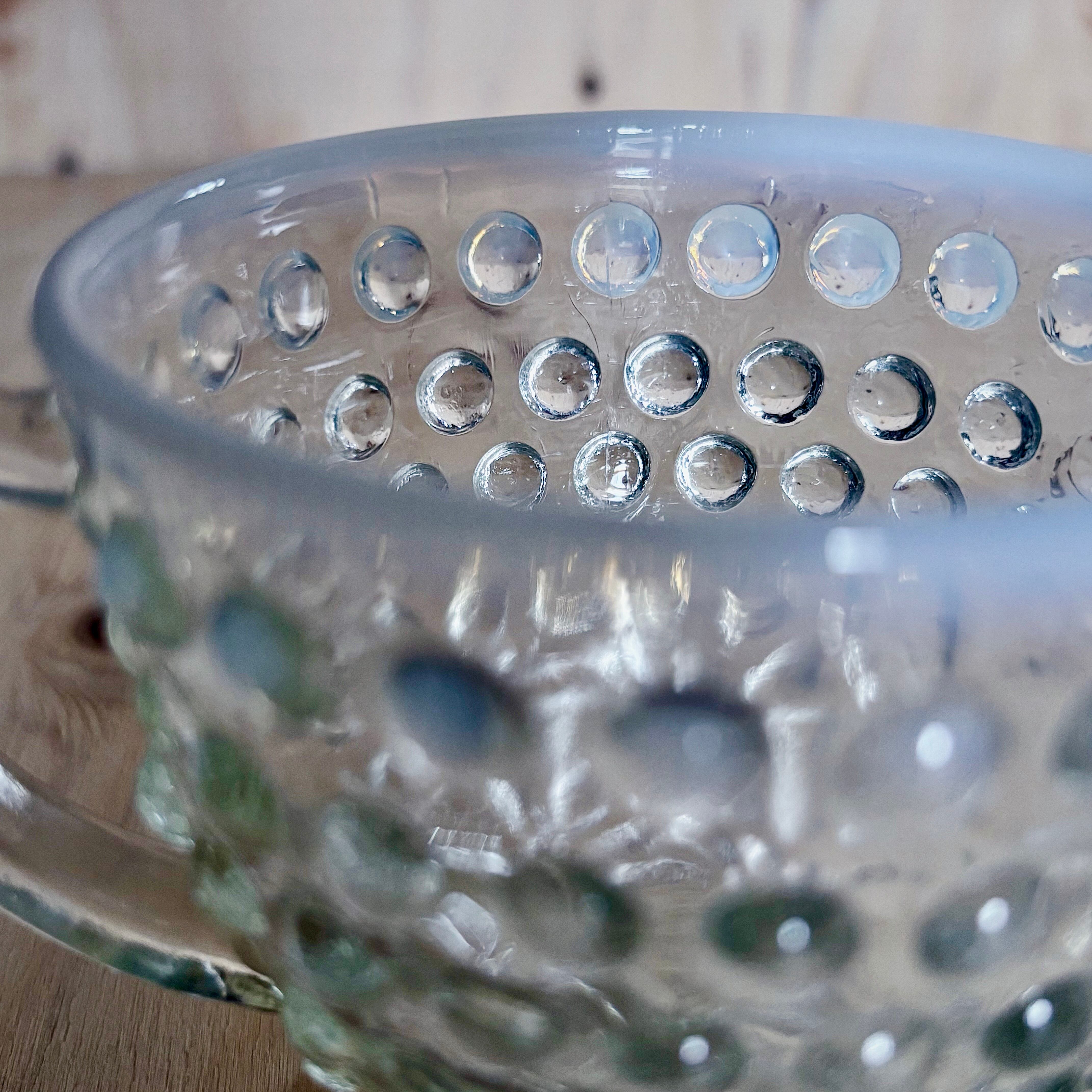 乳白色に縁取られたリムと、粒のように並ぶガラス装飾。その幻想的なカラーリングは、月長石という宝石をモチーフにデザインされたと言われており、ムーンストーンの愛称で親しまれています。砂糖壺としてはもちろん、小さなデザートやキャンディを盛り付けても映え、当時のアメリカンガラスならではの温かみと優美さを感じさせます。