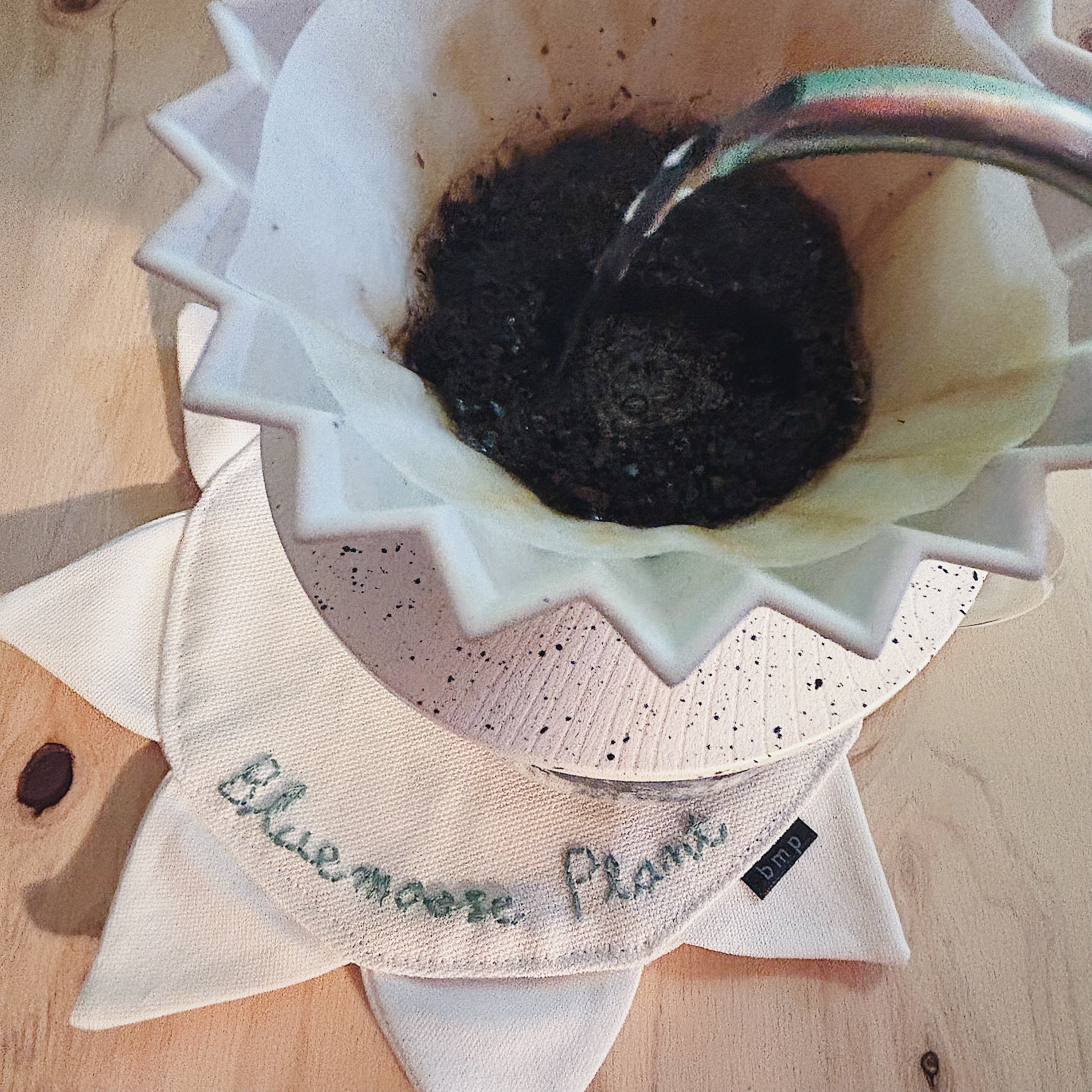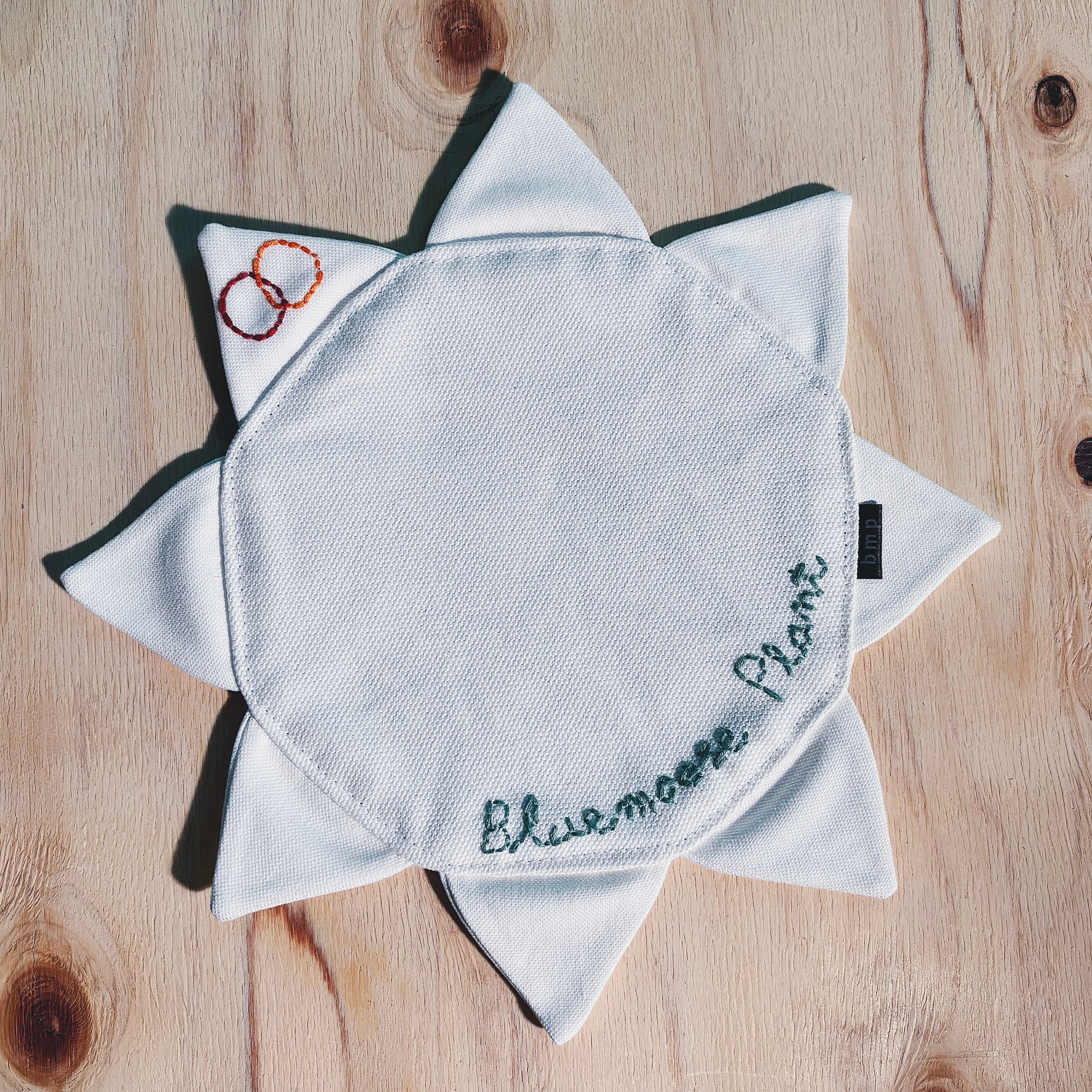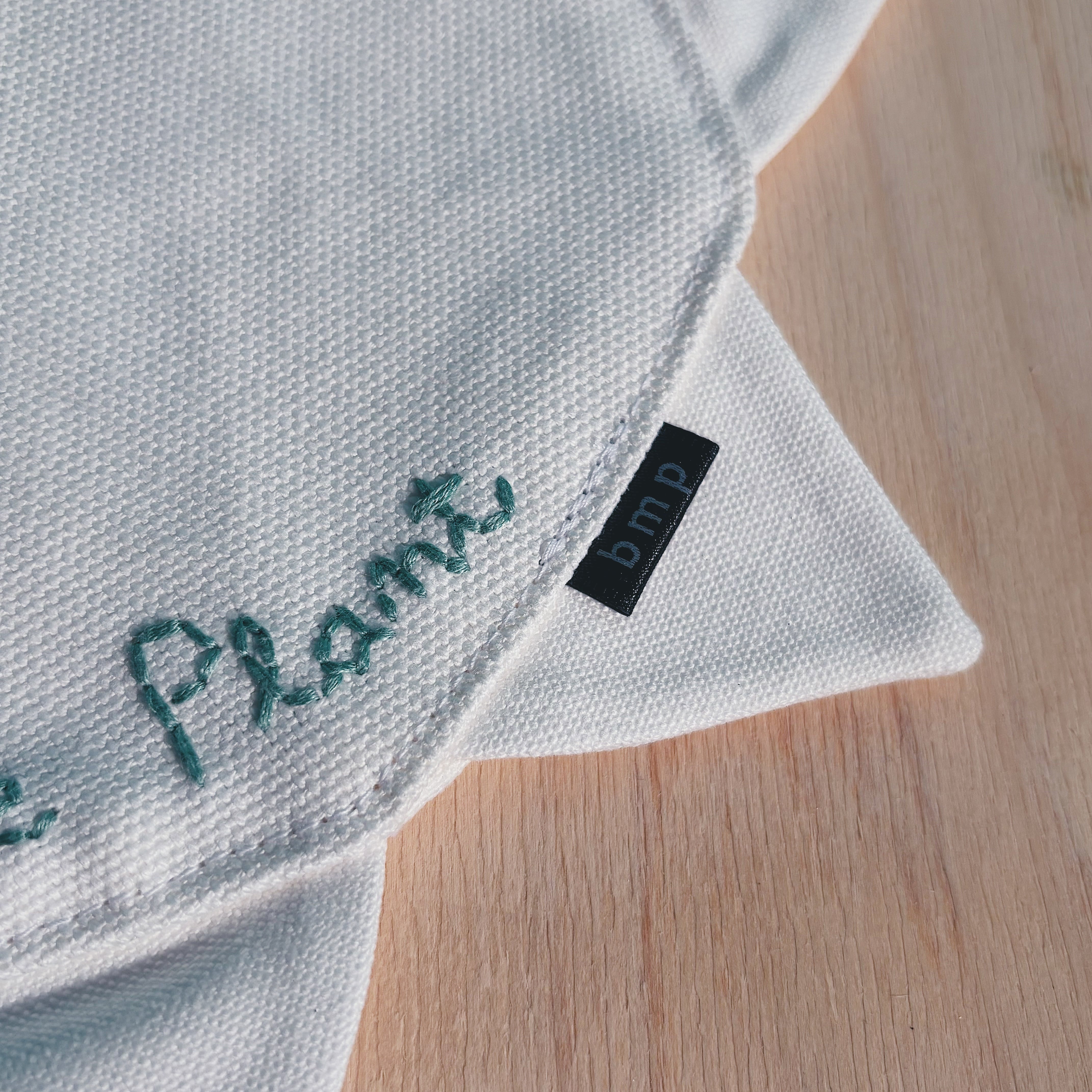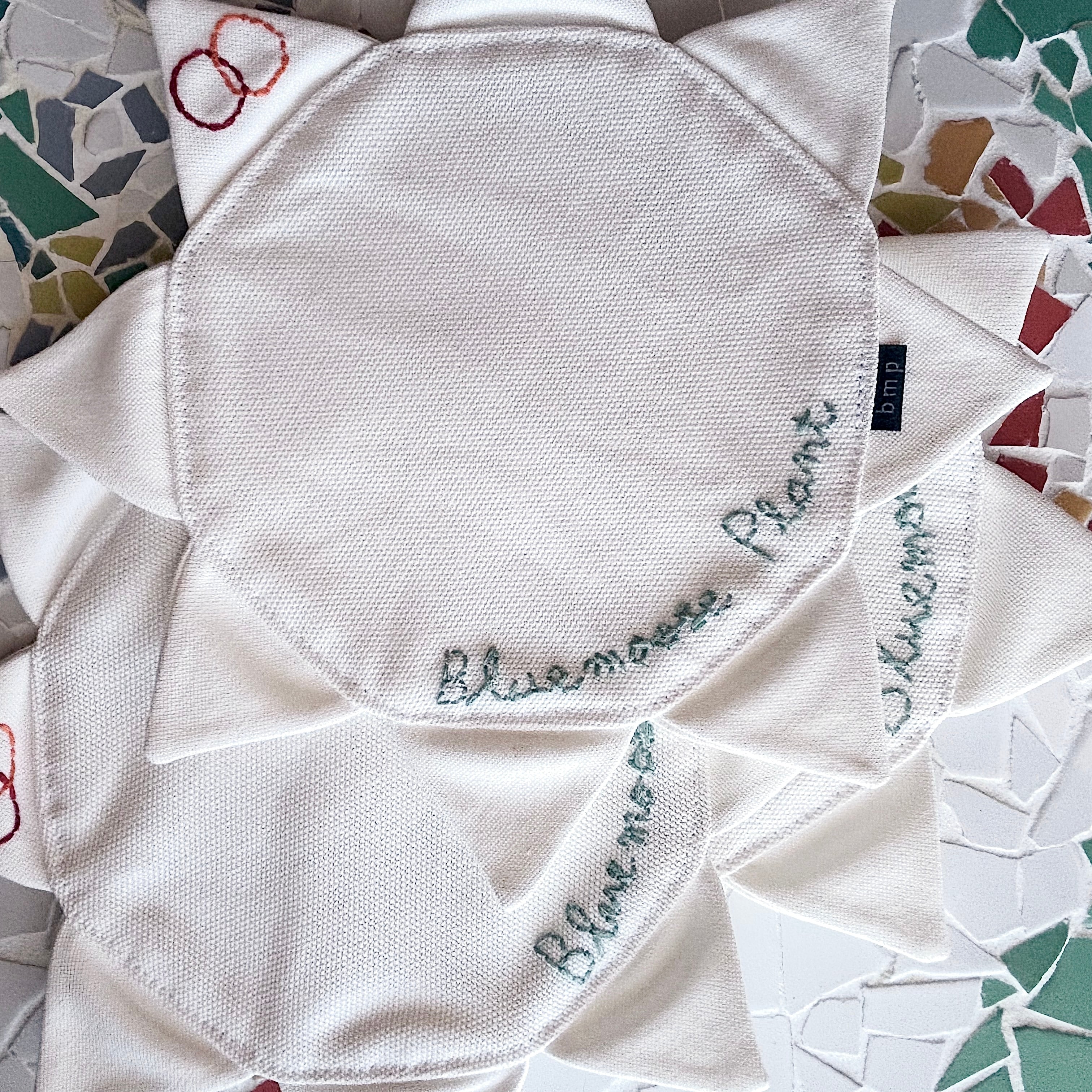 中央には Bluemoose Plantの名前を手刺繍であしらいました。ミシンでは出せない、わずかな揺らぎや線の表情が残る刺繍は、ひとつひとつ表情が異なります。使い込むほどに布とともに馴染み、時間の経過も含めて愉しめる仕上がりです。