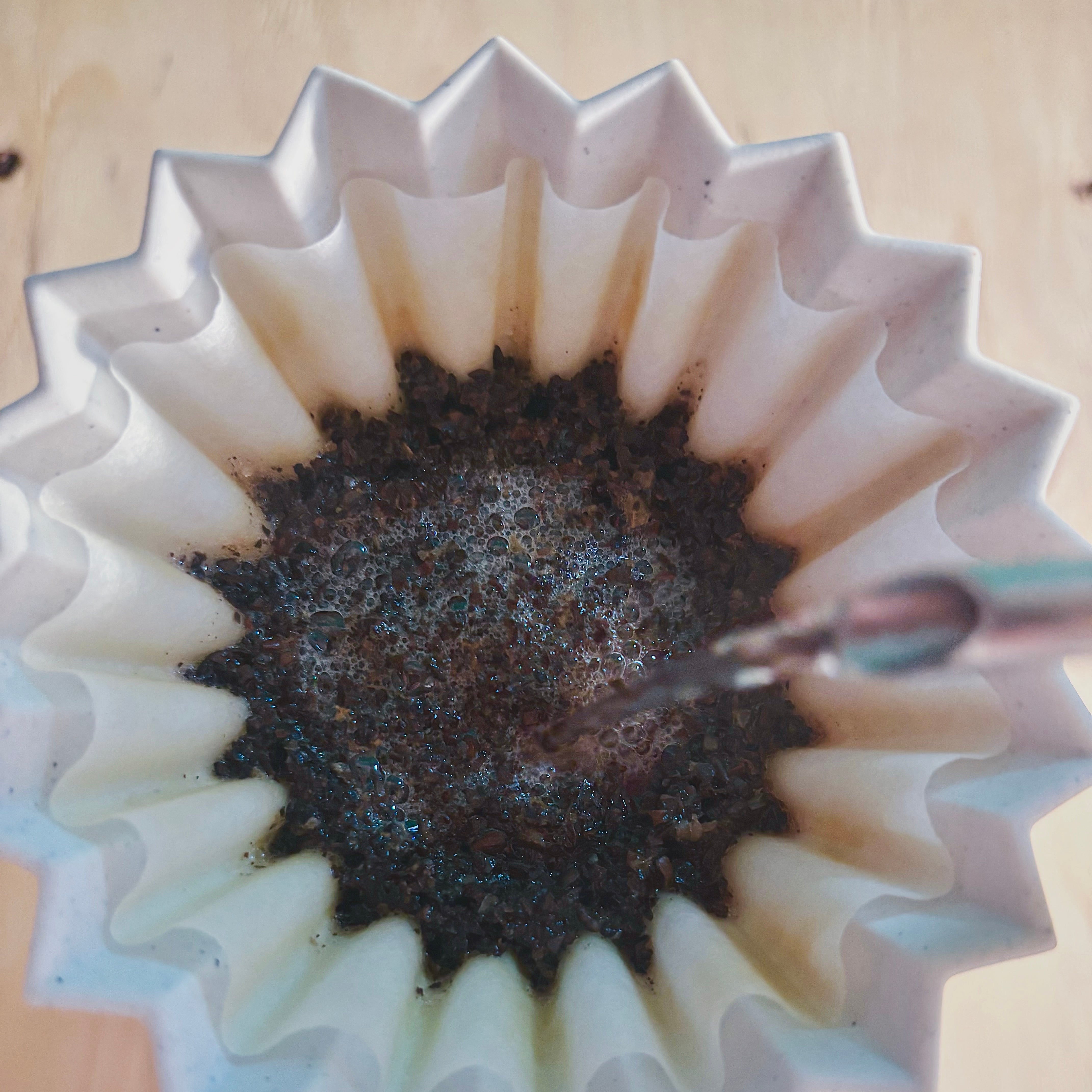 ORIGAMIのウェーブ型ペーパーフィルターは、均一なリブ形状によってドリッパーとの接地面が安定し、お湯がスムーズに抜けるのが特徴です。コーヒー粉の層が比較的浅くなるため、抽出のムラが出にくく、クリアでバランスの取れた味わいに仕上がります。