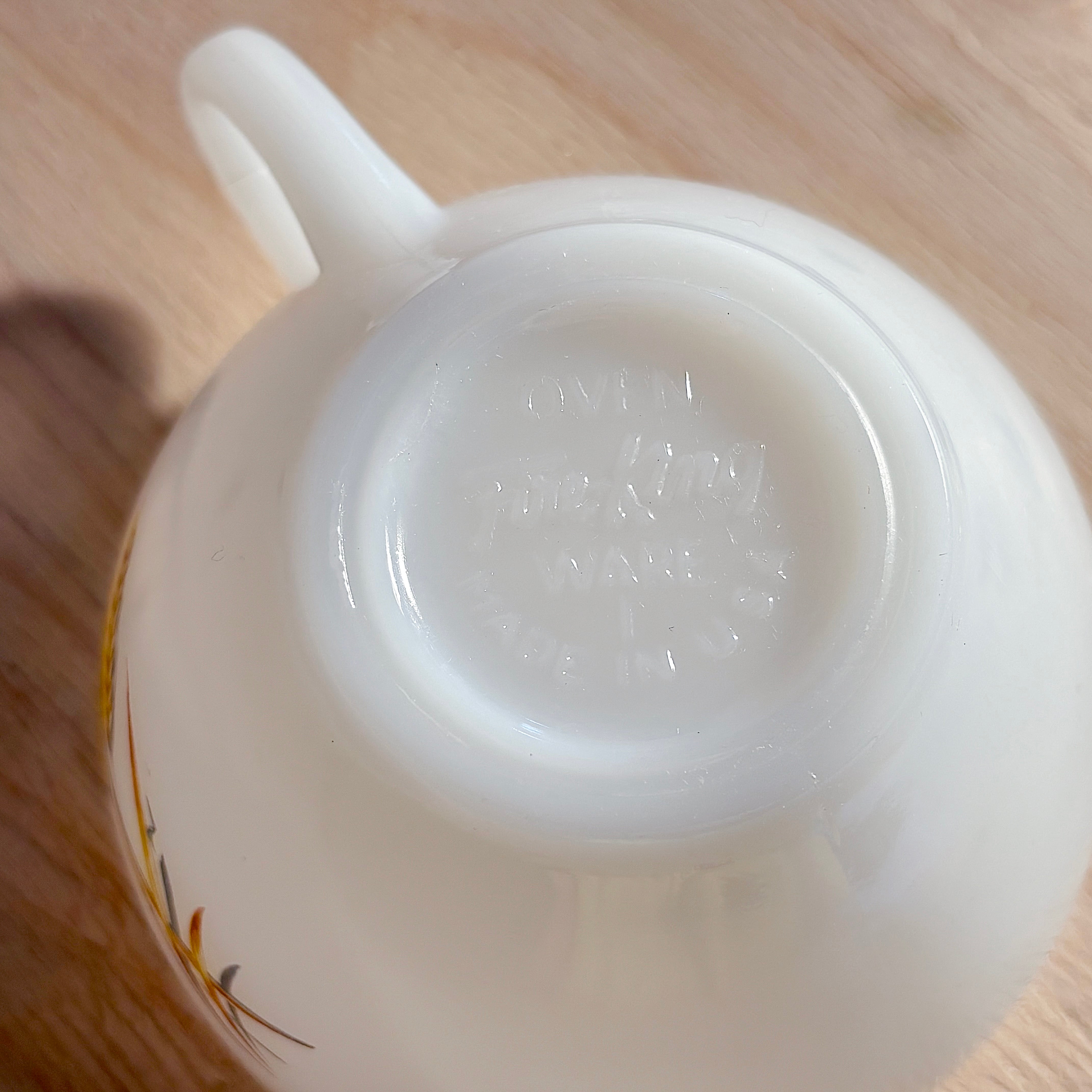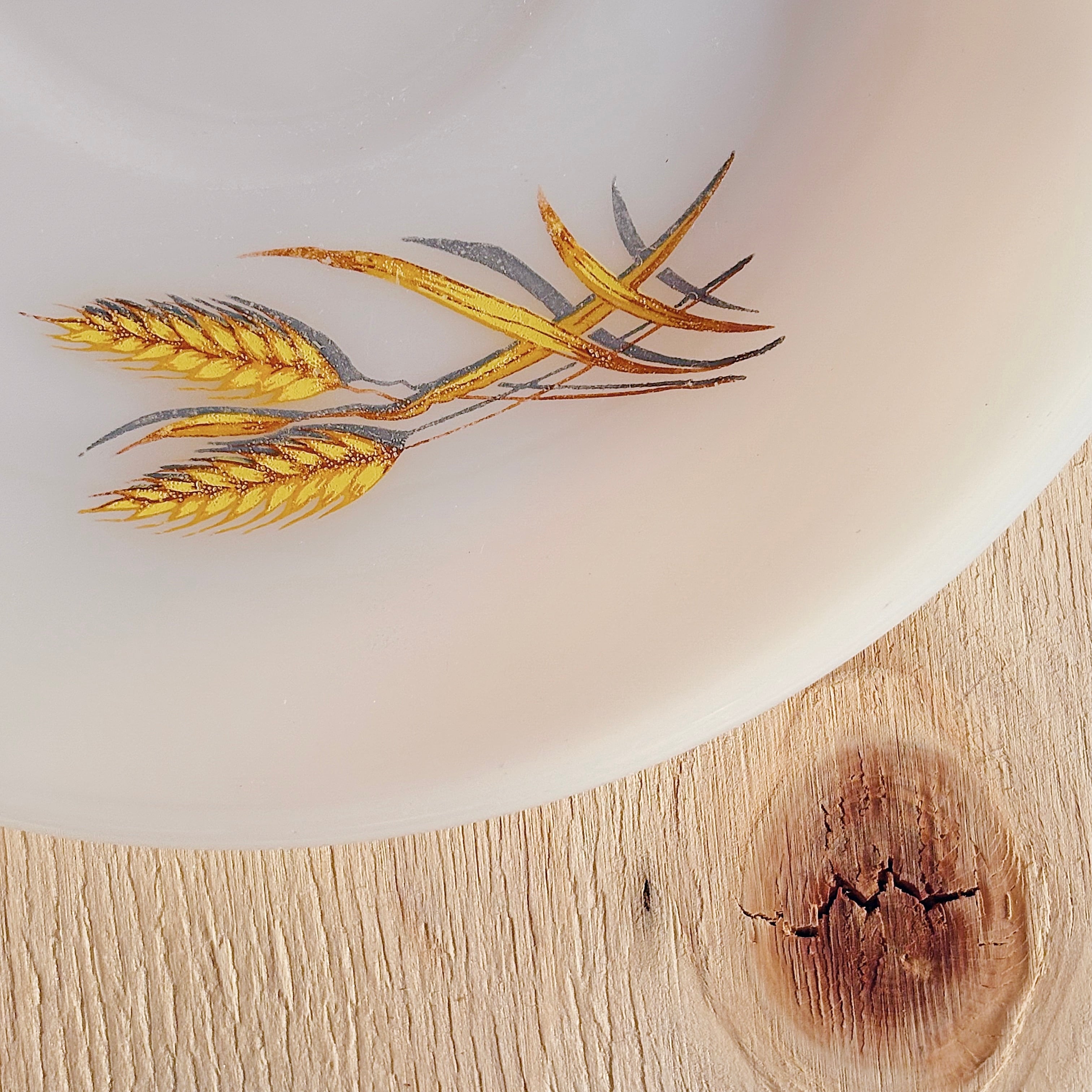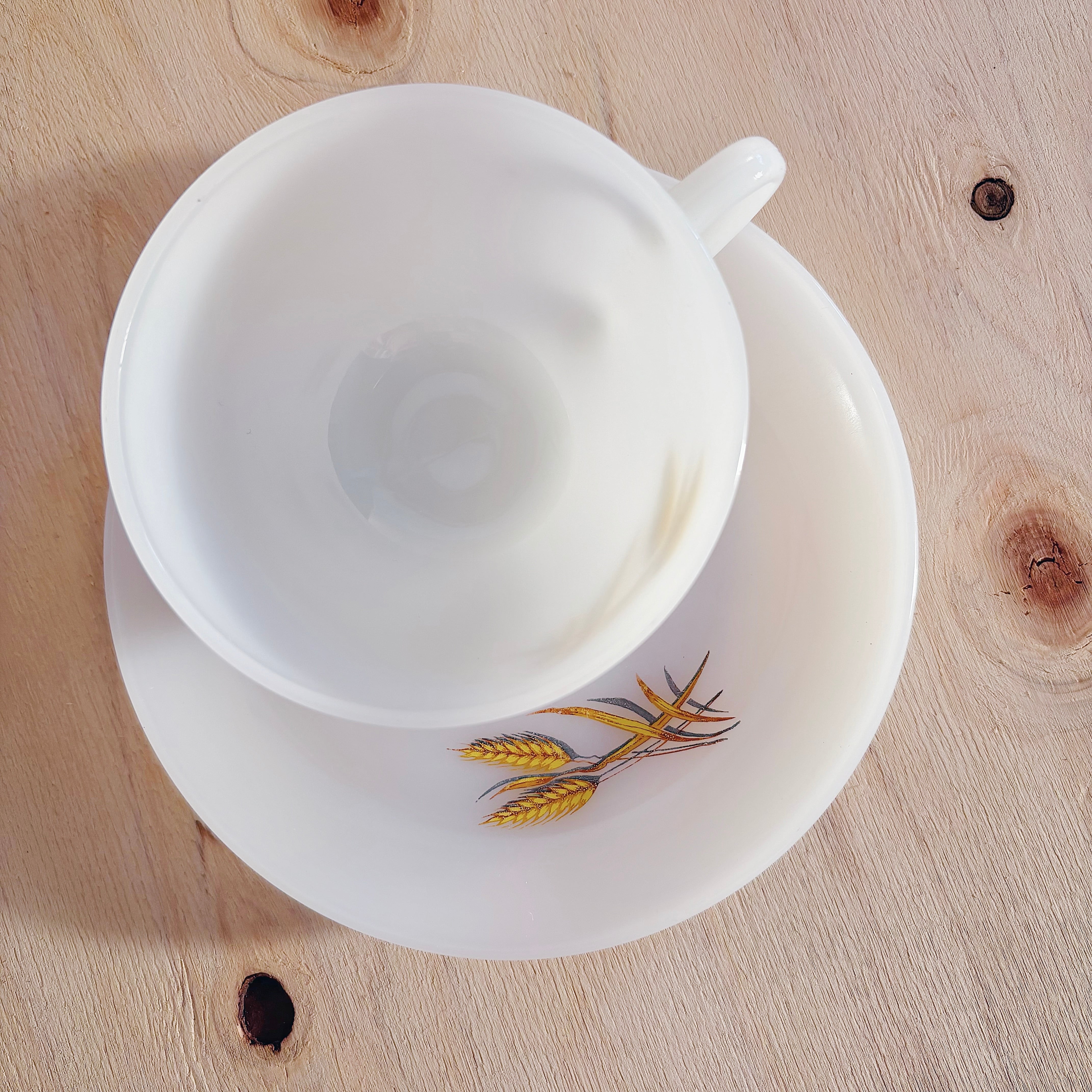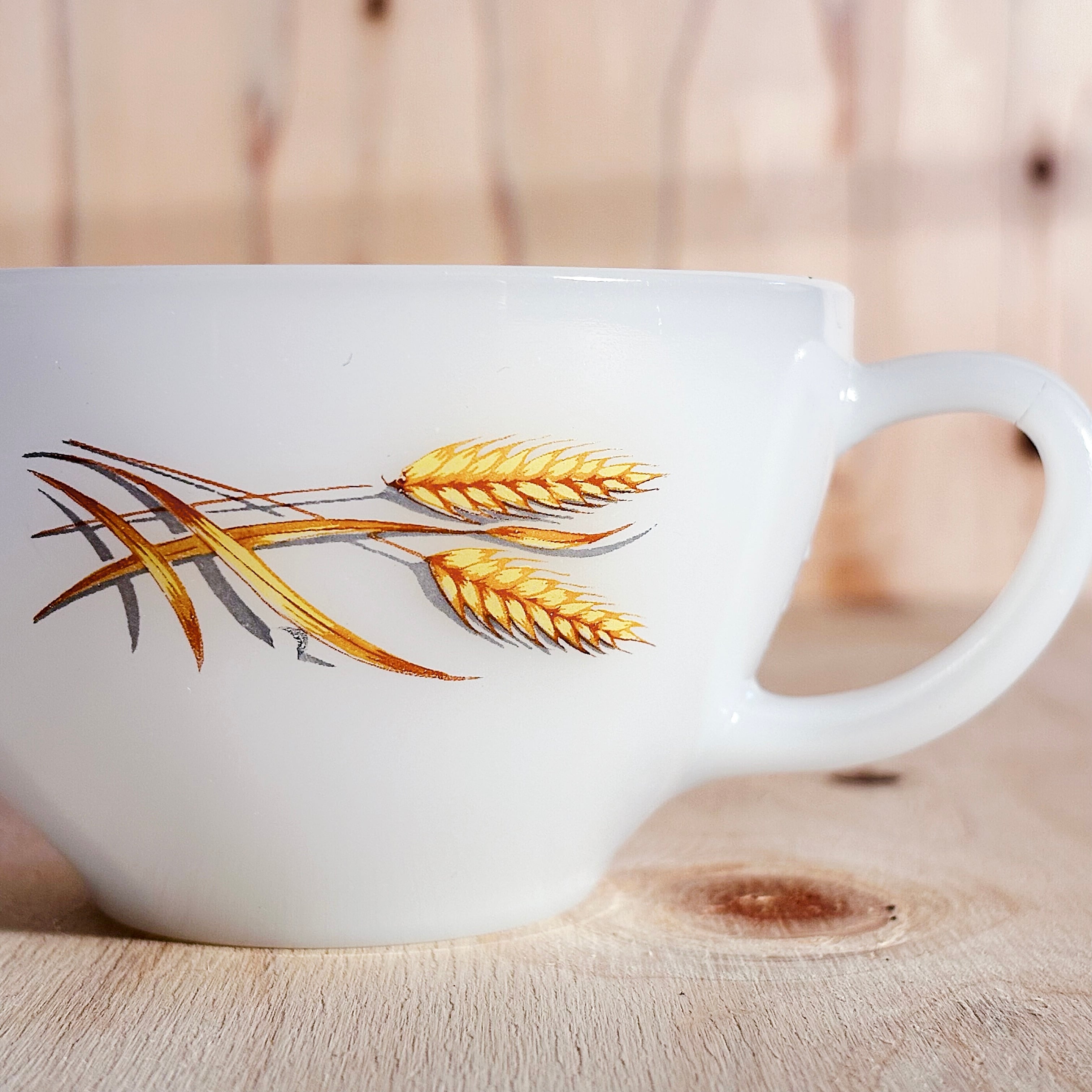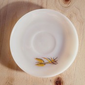 アメリカ Anchor Hocking 社のミルクガラスブランド「Fire-King」による、Wheat(ウィート)シリーズのカップ&ソーサー。ミルクガラスのやわらかな白に、黄金色の麦が描かれたノスタルジックなデザインです。